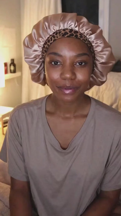 Protect your natural hair in style with this playful satin bonnet featuring a chic leopard print brim. The smooth satin fabric helps reduce frizz and breakage while you sleep, keeping your hair healthy and shiny. Perfect for adding a fun touch to your nighttime routine, this sleep cap combines comfort and flair effortlessly.