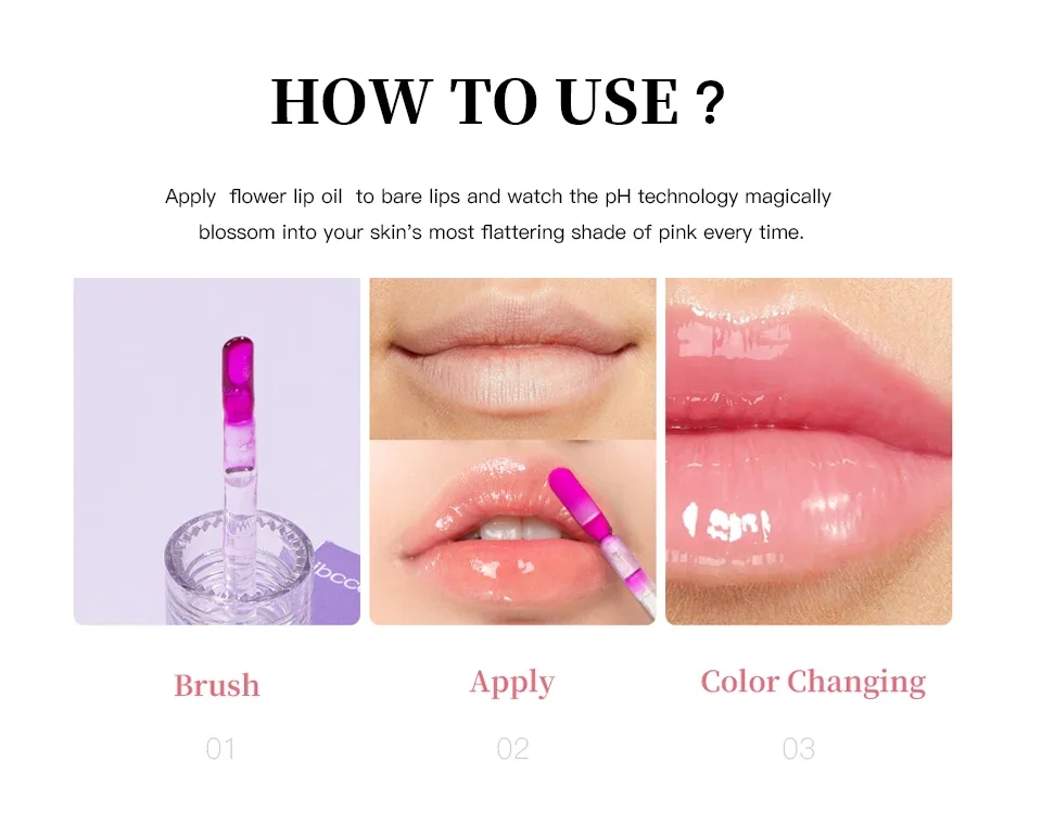 Flower lip oil is a color changing lip oil that applies clear, then reacts with lip's natural ph-level to blossom into the perfect uniquely lip makeup.