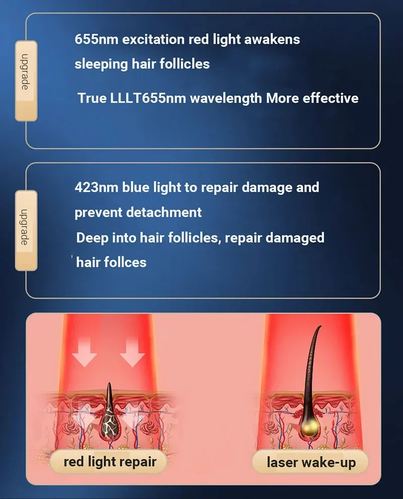 Using six infrared lamp beads and 4 blue lamp beads, the red and blue light waves penetrate deep into the hair follicles, repair damaged hair follicles, stabilize hair roots, and solve hair loss problems from the hair root.